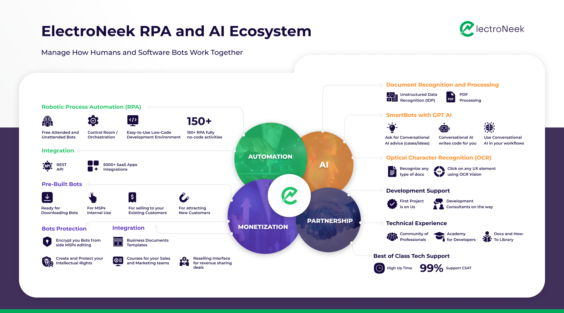 ElectroNeek provides free product training for all categories of users as well as business training on basics of IT marketing, sales and hiring for partners. Pre-built templates of bots allow for an easy start with first automated procesees.